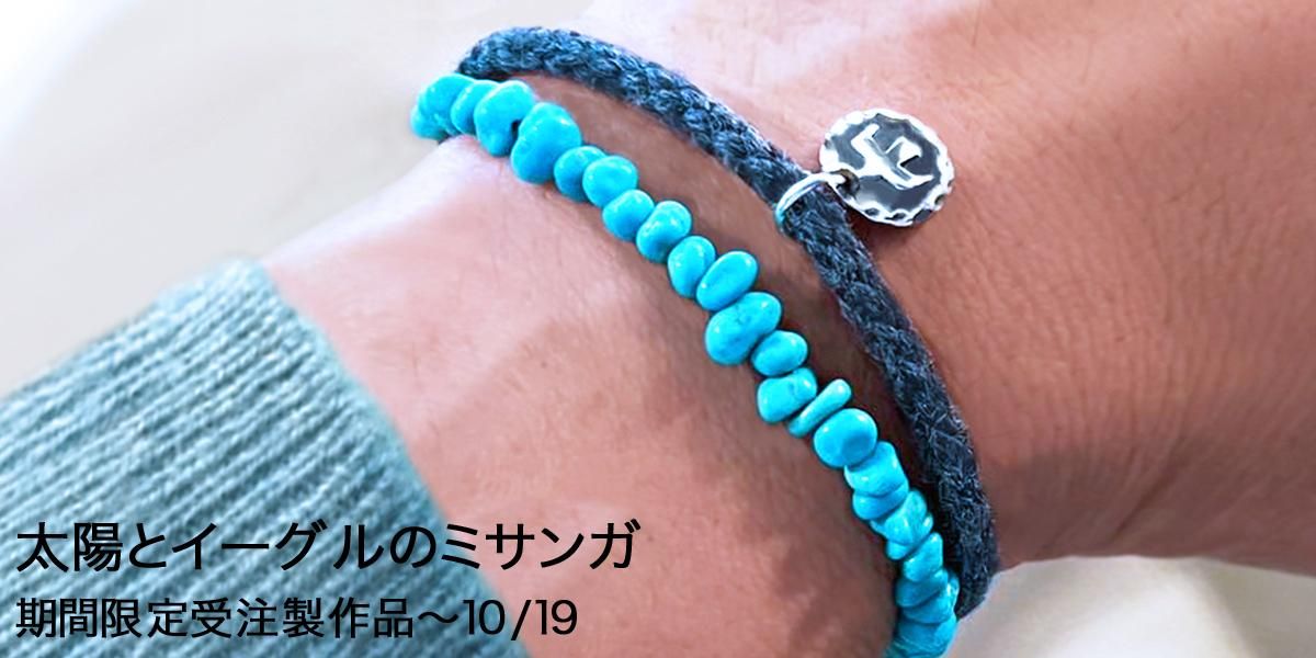 銀のヘッドを取り付けた、リネンミックスコードのミサンガです。このヘッドには、太陽に向かって飛ぶイーグルを象徴的に描きました。使用するリネンミックスコードは味わいのあるネイビー色で、各種ターコイズブレスとの相性も抜群です。麻を混ぜる事で杢調となり、あたたかみのある雰囲気となりました。ミサンガは手首や足首に巻きつけ使用し、自然に紐が切れたら願い事が叶うとされています。